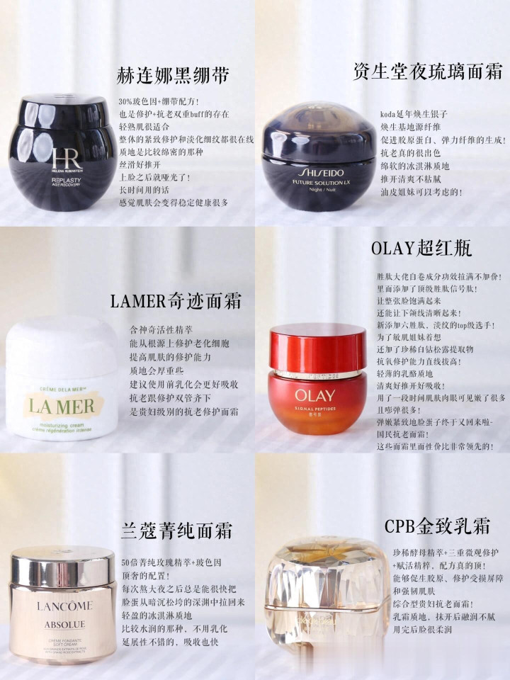 现在的面霜基础的保湿和滋养度都做得差不多,关键就是如何改善和预防肌肤衰老的问题,很多人一看到抗老成分就入手,也有人看到别人用了效果好就入手,其实每一款面霜都有它独特的作用,选择适合自己的,才是关键,最后分享一下这6款抗老面霜的使用感受吧!